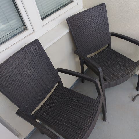 Sex grå konstrottingstolar med armstöd och hög rygg, passar bra runt ett utebord. 6 svarta sittdynor ingår på bilderna (de är använda o kan tas av o tvättas ). Sex helt oanvända vita fodral till stolarna ingår också.