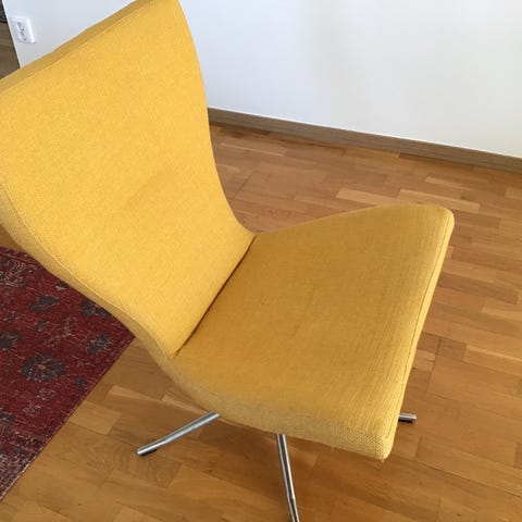 Fåtöljen har en svängbar krombas och en fast stoppad sits.