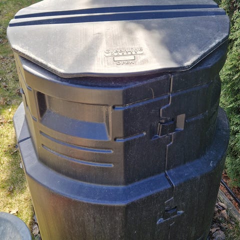 Svart kompostbehållare för trädgården med lock upptill. Har ventilationsöppningar på sidorna och står stadigt på marken.