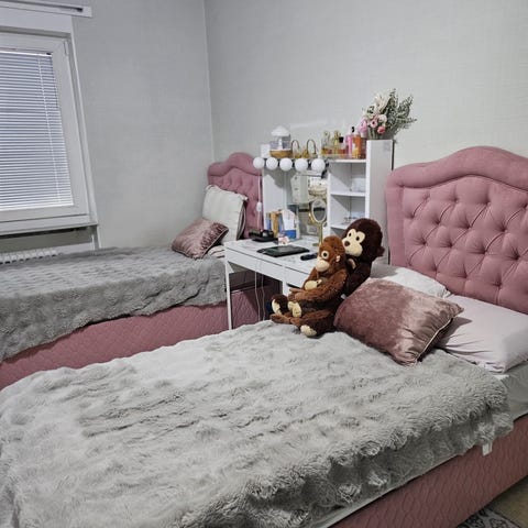 säng med förvaringslådor och sminkbord med lampor i bra skick