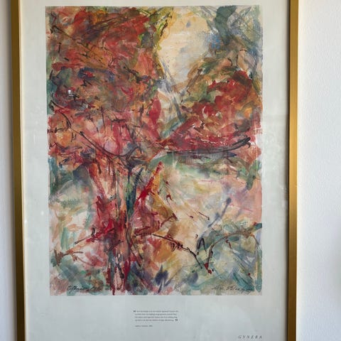Fin tavla med färgglada fåglar och blommor i brun träram. Passar bra att hänga direkt på väggen med den medföljande ramen.