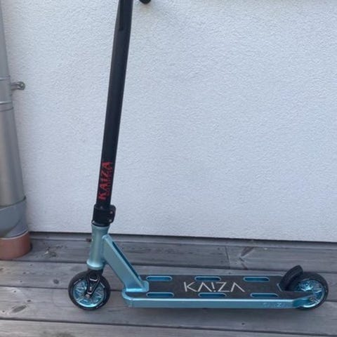 Firefly trick-sparkcykel i blått och orange. Stadigt i däck och hjul, bra för barn som gillar att köra sparkcykel.