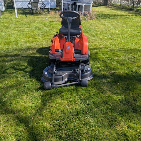 Husqvarna R112C åkgräsklippare i orange med frontmonterat klippaggregat. Bekväm stol och enkel rattstyrning,
