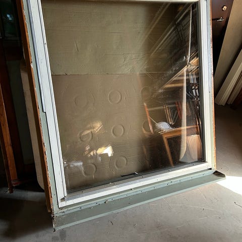 Stort träfönster med isolerglas och öppningsbart beslag nertill. Har karm runt om och metallbeslag på sidorna. Storlek: 10 x 13