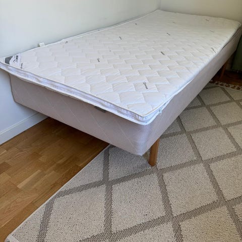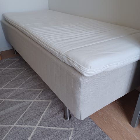 Grå säng från IKEA, 90x200 cm med bäddmadrass ovanpå. Står på metallben och är lätt att möblera in mot väggen.