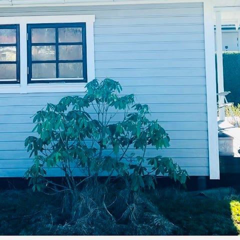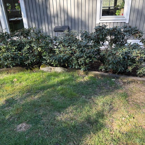 Fina, stora rhododendronbuskar som står samlade längs husväggen. Täta buskar med mycket gröna blad, redo att grävas upp av den som vill ha dem. Kan ordna uppgrävning mot betalning. 6 st stora buskar. 2000 kr st eller 10000 för alla
