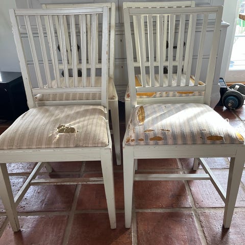 Säljer två vitmålade stolar i trä med stoppad avtagbar sits. Sitsen är klädd i ett nytt blått tyg.
