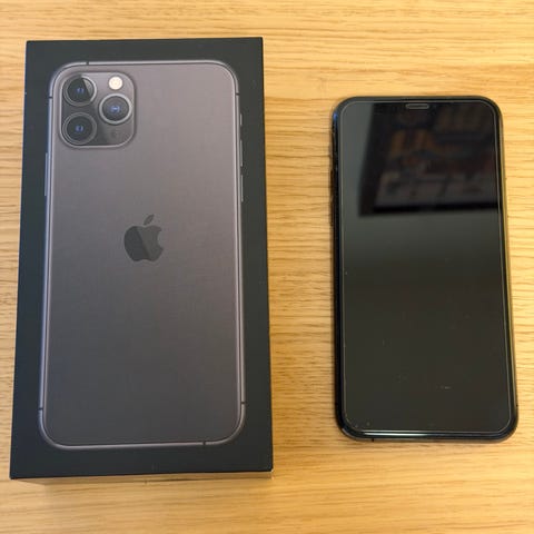 Apple iPhone 11 Pro med 64 GB lagring i grå färg. Stor skärm med tre kameror på baksidan och levereras i originalkartong enligt bild.