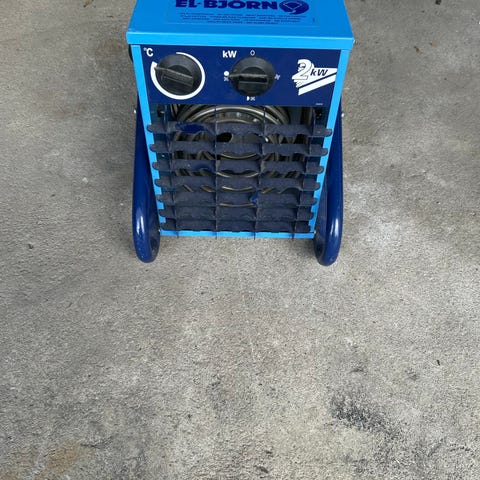 El-Björn byggfläkt i blått med rejält galler framtill. Har vred för temperatur och lägen på sidan samt kraftig elkontakt.