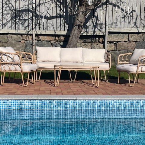 Kvalitén och nypris på Cane-Line är sjukt högt. Slumpas för 9999kr och du får vår-tvätta själv. Glasskivorna på borden är tyvärr borta.