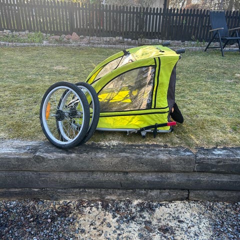 Praktisk cykelvagn för hund i gul/svart med stora hjul. Dragstång fram och flera nätfönster som kan öppnas med dragkedja. Bicycle Trailer
