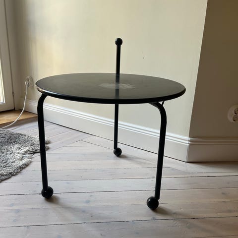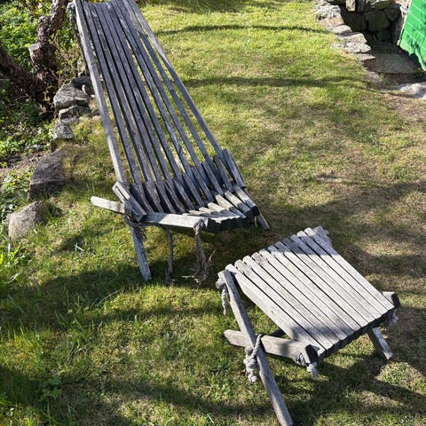 Runt bord och stolar i dåligt skick. Metallstommar stabila men träet behöver bytas.