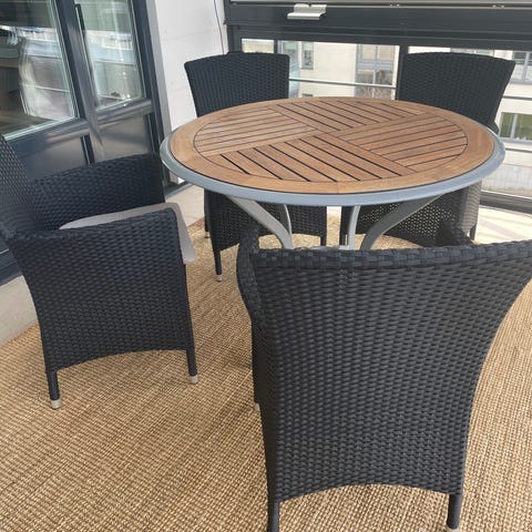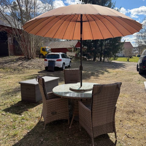 Rund trädgårds bord med en parasoll OBS UTAN STOLAR