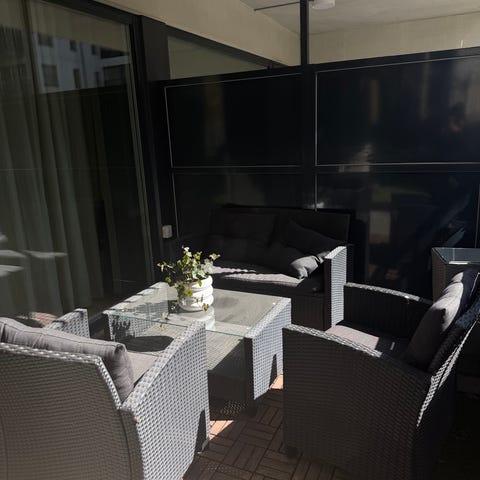 Svart utegrupp i konstrotting med två fåtöljer och rektangulärt bord. Fåtöljerna har sittdynor och bordet har plan ovansida av glas som är lätt att torka av.