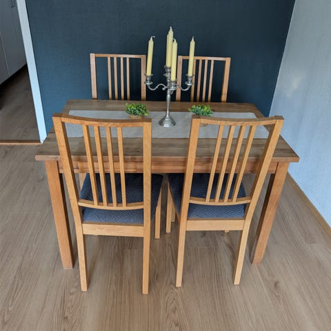 Ett stort matbord som rymmer många sittplatser, då det finns 2 st extra bordsskivor som ligger under bordet.