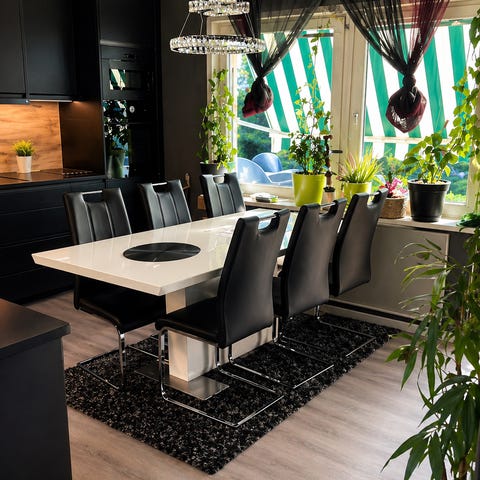 Svart, rustikt matsalsmöblemang med integrerad, grå snurrskiva. (Lasy Susan)