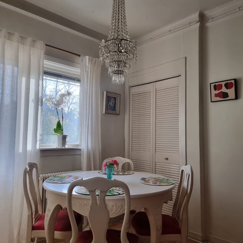Dekorativ ljuskrona, bohemisk stil från 1900-talets Maria Theresa-design. Inköpt på antikaffärer i Vasastan för ca 20 år sedan. Otroligt fint ljus. Passar bara inte i vårt hus.