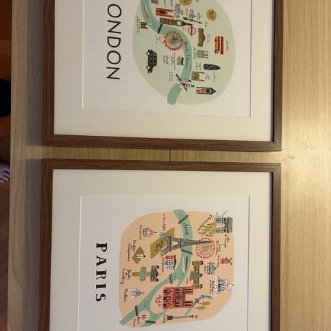 Inramade posters London och Paris från Design House Stockholm. Har hängt på väg i barnrum. 300 kr för båda.