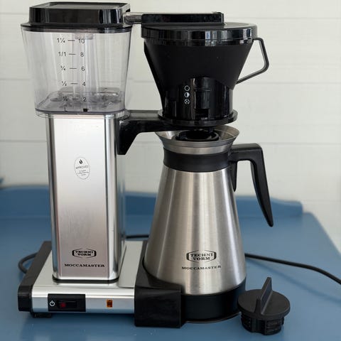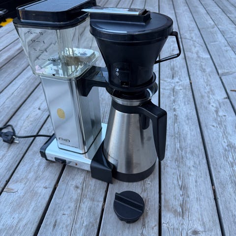 Moccamaster kaffebryggare i vit färg med svart filterhållare och glaskanna. Enkel att använda med tydlig vattennivå och löstagbara delar för bryggning.