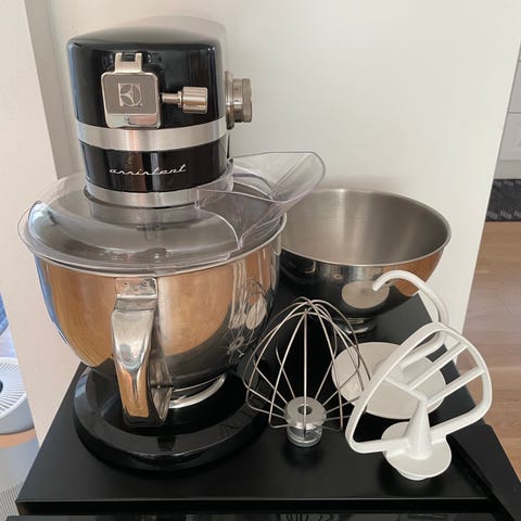 Electrolux köksassistent i röd färg med stor rostfri bunke och vit plastbunke. Följer med flera olika vispar och degkrok så du kan både vispa och knåda smidigt.