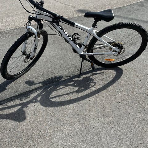 Specialized mountainbike i stl S med 27,5"-hjul och vit ram. Utrustad med skivbromsar, Shimano-växlar och grova däck för bra grepp.