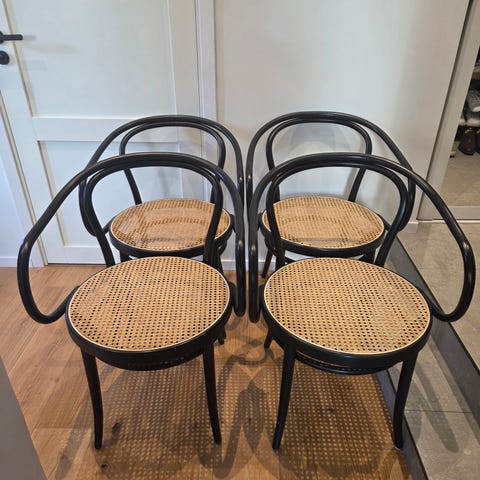 6 Thonet stolar i mycket fint skick. En av stolarna är lite lite trasig i rottingen ( se bild 6) annars är alla hela och fina. Köptes nya 2020.