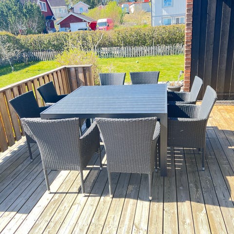 Matgrupp utomhus med bord och 8 stolar grå/vit