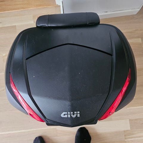 Givi toppbox i svart med röda reflexer. Fäste till MC medföljer (har suttit på Kawasaki). Mått 400 x 520 x 330.
