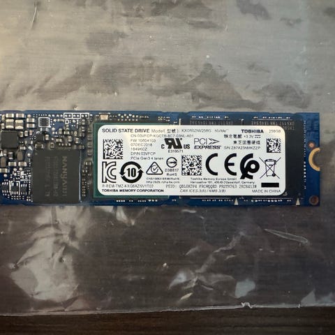 Samsung M.2 NVMe SSD med blått kretskort och etikett på ena sidan. Levereras i vit plastbricka med medföljande häfte från Samsung Solid State Drive. Jag hittade den i min lägenhet. Jag vet inte om den ser ut att fungera. Du kan komma och kolla in den.