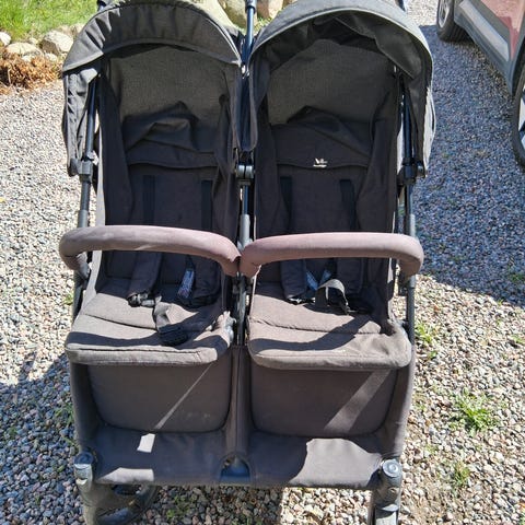 Emmaljunga syskonvagn med två sittdelar i mörk färg och trepunktssele i båda sätena. Har svängbara framhjul, varukorg under vagnen och justerbart handtag.