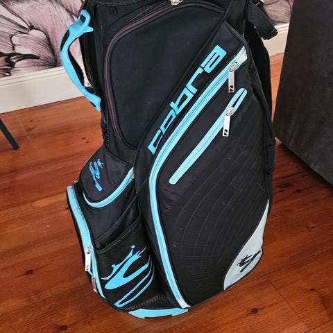 Cobra golfbag i rosa och svart med flera dragkedjefickor runt om. Topp med många fack för klubbor och bärhandtag på sidan för enkel hantering. Regnskydd och huva ingår.
