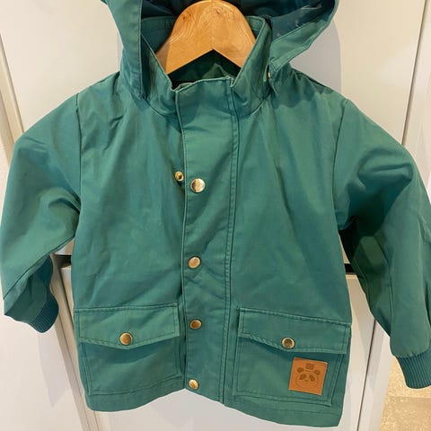 Svart dunjacka från Mini Rodini i stl 98, unisexmodell med huva. Dragkedja med knappar över och flera fickor fram, grön insida.