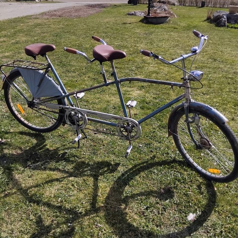 Säljer en 3-växlad tandem i så gott som toppskick, bild på litet skrapmärke på bakskärmen för övrigt inget vad jag kan se. Den har stått inomhus.