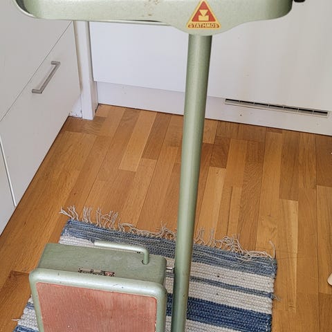 Personvåg som stått på Centralbadet. Gammal myntdriven personvåg från Seitz-Werke Kreuznach med texten ”Personvåg med viktbiljetter”. Har mörkblå stomme, guldfärgade detaljer, mätare upptill och biljettfack. Vågen matar ut biljett när 10 öre placeras i facket. Finns fåtal biljetter och 10-öringar, fungerade senast den var i bruk. Fantastisk pjäs enbart som rekvisita eller inredning.