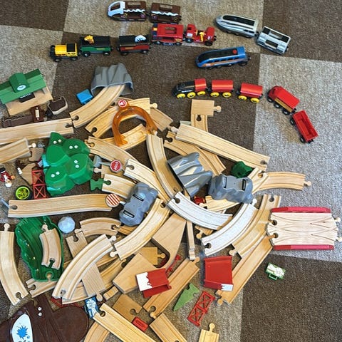 BRIO trätåg med flera färgglada lok och vagnar samt en plankorsning med bommar. Medföljer även en låda med olika träskensdelar som går att bygga bana av. Ett elektroniskt look.