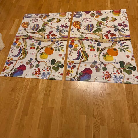 På Svenskt Tenn kostar tyget 2100 SEK/meter. Det betyder att en längd skulle kosta 3612 SEK och alltså 7224 SEK för båda. Du får båda för 4000 SEK.
