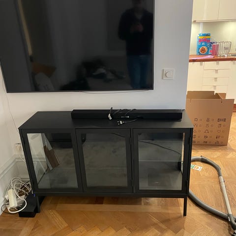 Klassiskt vitrinskåp i träfanér med hyllor och skjutdörrar. Kan användas som tv-bänk. Fint bruksskick.