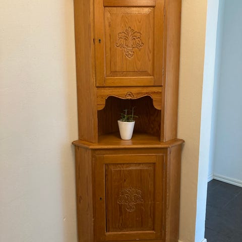 Hörnskåp i fint skick, ca 180 högt. Saker inuti ingår ej...