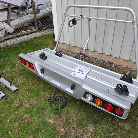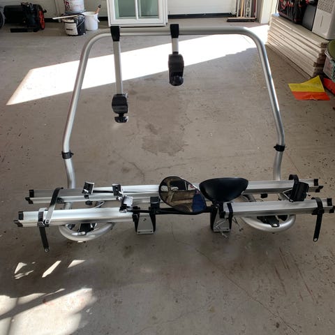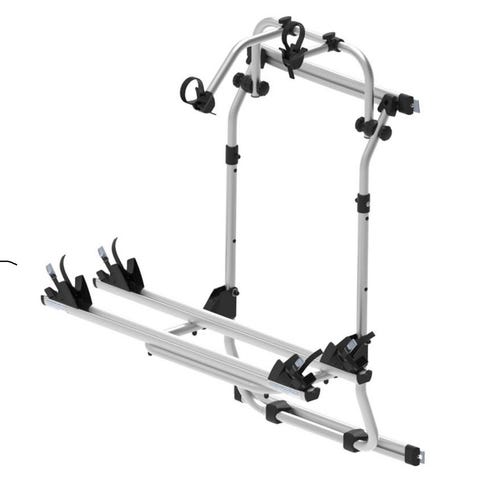 Thule cykelställ i silver med flera justerbara armar och remmar för att spänna fast cyklarna. Följer med monteringsdetaljer och instruktioner som syns på bilderna. Satt monterat på vår nya husbil.