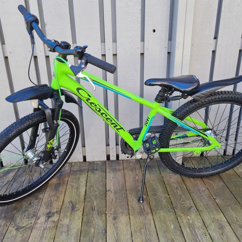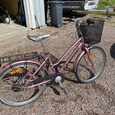 Sjuväxlad juniorcykel med dämpargaffel, fotbroms och skivbroms fram. Utrustad med skärmar, lås, pakethållare och stöd. Mycket fint skick!