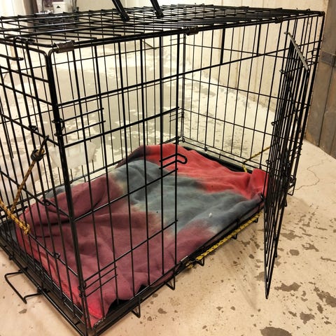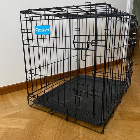 Svart metallbur för hund med galler runtom. Har dörr fram och uttagbar bottenplatta för enkel rengöring.