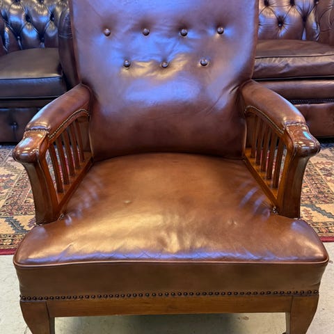 Möbeln är klädd i original brunt läder på en stomme av skum. Dynorna är avtagbara. I mycket gott originalskick.