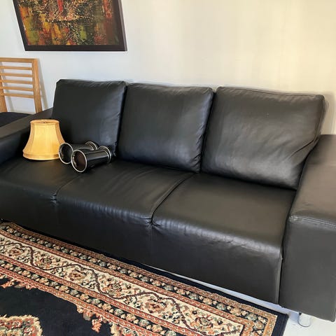 Brun soffgrupp i läder med en 3-sits soffa och två matchande fåtöljer. Raka armstöd och metallben ger ett enkelt och stilrent utseende som passar bra i vardagsrum eller kontor. Visst slitage förekommer på framförallt armstöd (se bilder).