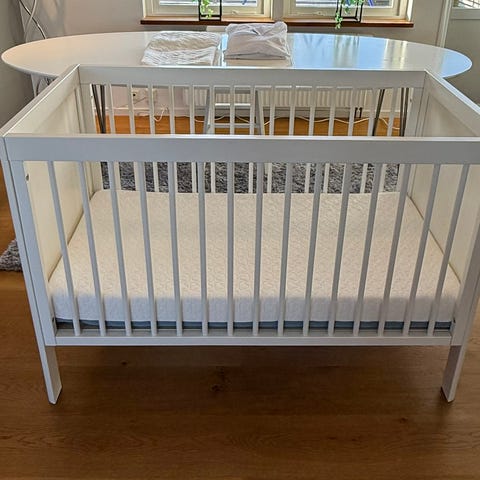 Sundvik IKEA spjälsäng med ribbotten, madrass och madrasskydd