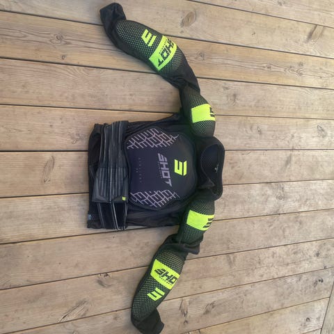 Motocrosskläder från bland annat Alpinestars för barn i blandade storlekar runt stl 116-140, flera färgglada byxor och tröjor. Ingår även skyddsutrustning som bröstskydd från Shot i storlek Youth S med både ryggskydd, axelskydd och armskydd i samma, benskydd från Raven och nackskydd från Alpinestars med justerbara remmar och klickfästen.