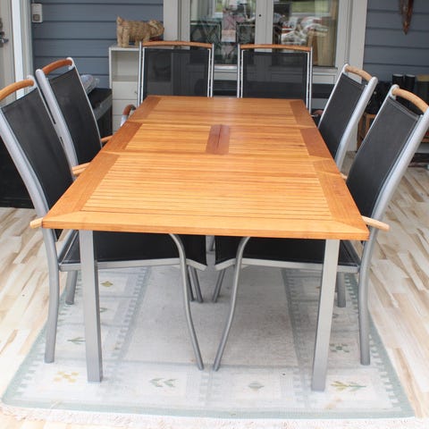 Matgrupp för uteplats med avlångt trädgårdsbord i trä och fyra matchande stolar. Bordet har hål för parasoll i mitten och stolarna har höga ryggar och armstöd. 180/230x 100 Behöver slipning o olja. 2 stolar som behöver lagning medföljer liksom 6 dynor i bra skick.