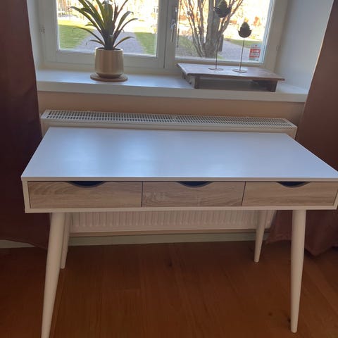 Skrivbord från Jysk i vitt med en låda och öppen hylla under skivan. Ben i trä som står stadigt och ger bra plats under bordet.