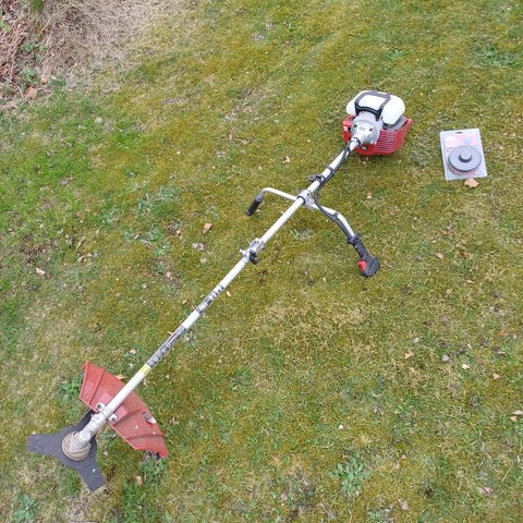 Begagnad röjsåg optimerad för gräsröjning. Fint skick, ej mycket använd. Komplett med sele, trimmerhuvud + skydd, slyklinga + skydd, röjklinga + skydd.