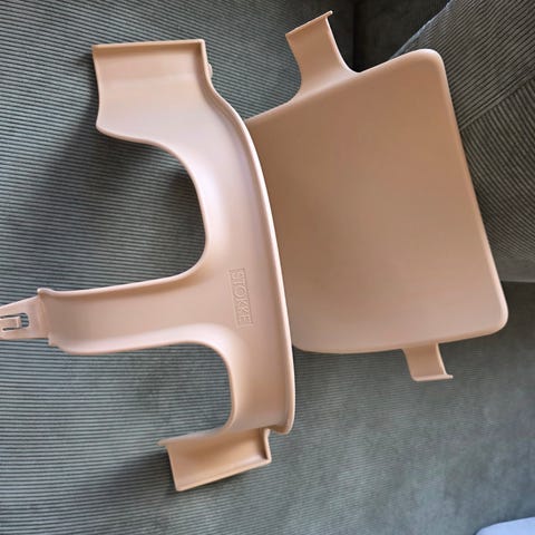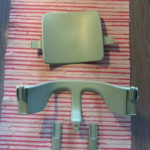 Tillbehör till Stokke matstol. Vit bricka, bygel och ryggstöd i grått. Sitt- och ryggdyna i fint skick. Sele i förpackning, endast använd vid enstaka tillfälle.