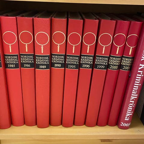 Röd uppslagsverksserie Nordisk Kriminalkrönika i 12 band i samma utförande, lotband Linne med Skinnrygg. Snygga ryggar med guldtext som gör sig bra i bokhyllan.